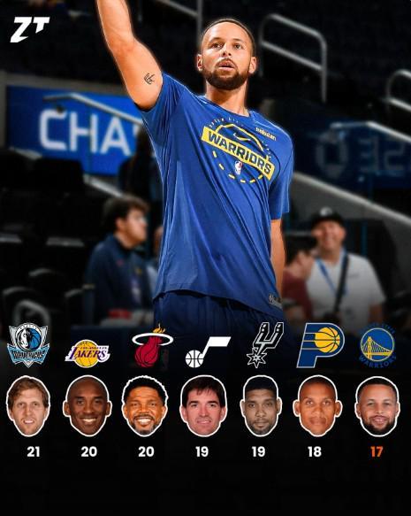 斯蒂芬-库里即将迎来为勇士队效力的第17个赛季,他也将成为NBA历史上第七位,为单一球队效力超过17年的球员。